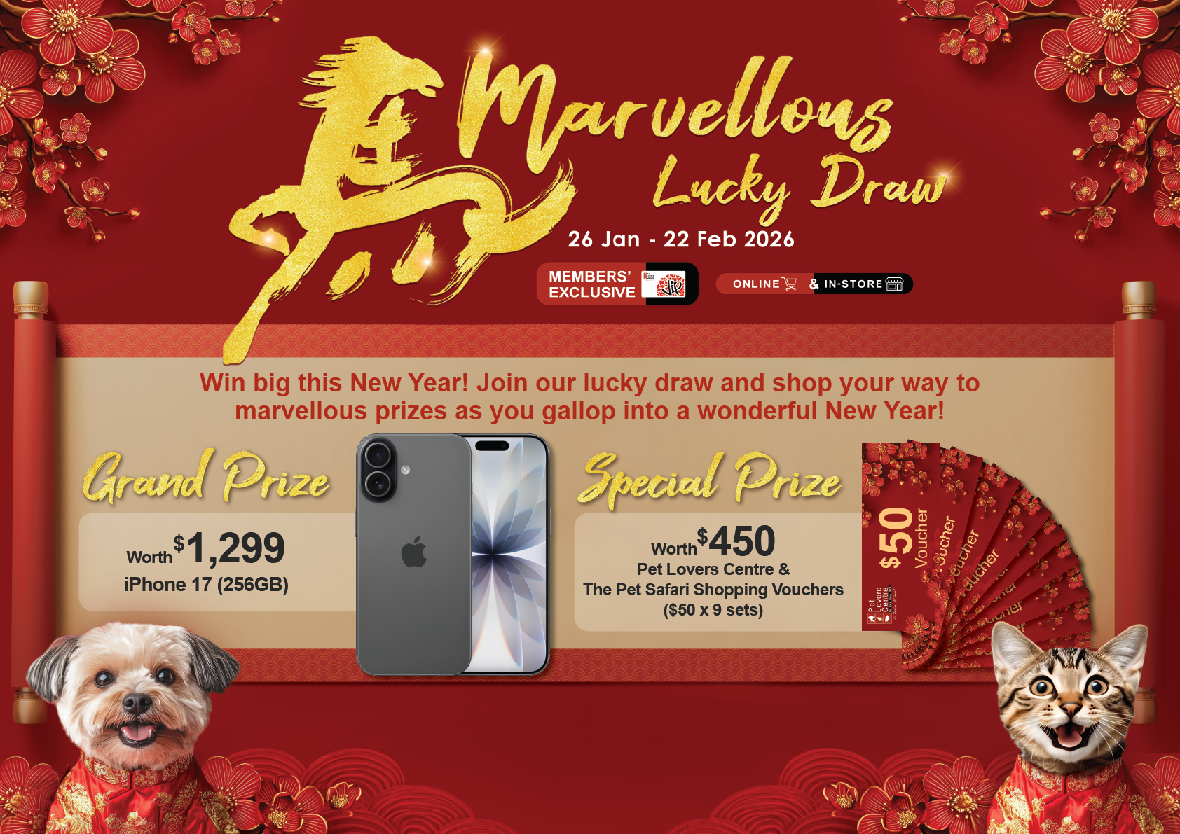 Prizes for the Lucky Draw include 1x iPhone 17 (256GB) and 9x $50 Pet Lovers Centre gift vouchers. The gift vouchers are valid until 30 June 2026.
